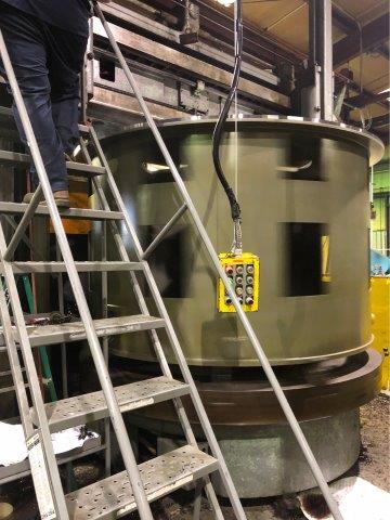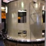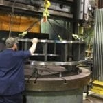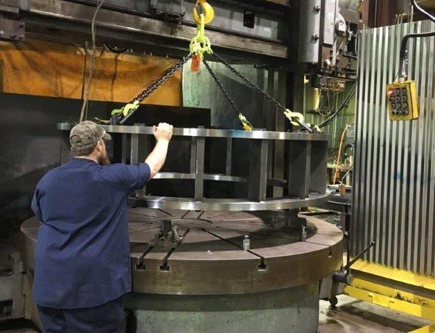 New vertical turret lathe capable of swinging 120 inches. Pictured is the stator retention frame for a 1250 horsepower, 36 pole circulating pump motor manufactured for a nuclear power utility.